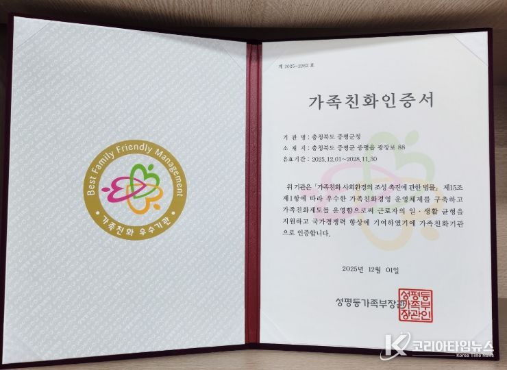 코리아타임뉴스 박찬식 기자 | 충북 증평군은 성평등가족부가 주관하는 가족친화 인증심사에서 ‘가족친화 인증기관’으로 5회 연속 선정됐다고 20일 밝혔다.