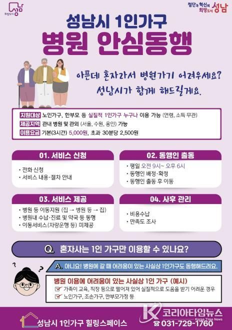 코리아타임뉴스 경기취재본부 | 성남시는 ‘1인 가구 병원 안심 동행 서비스’ 추진을 위해 전문 인력을 기존 4명에서 5명으로 늘렸다고 22일 밝혔다.