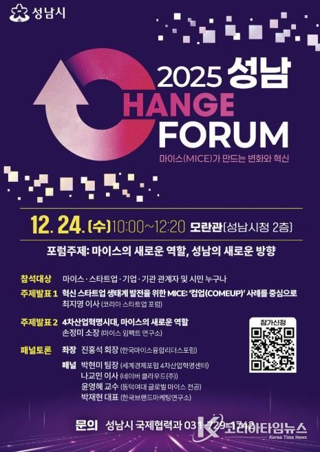 코리아타임뉴스 경기취재본부 | 성남시는 오는 12월 24일 오전 10시 성남시청 모란관에서 ‘2025 성남 체인지 포럼(CHANGE Forum)’을 개최한다.