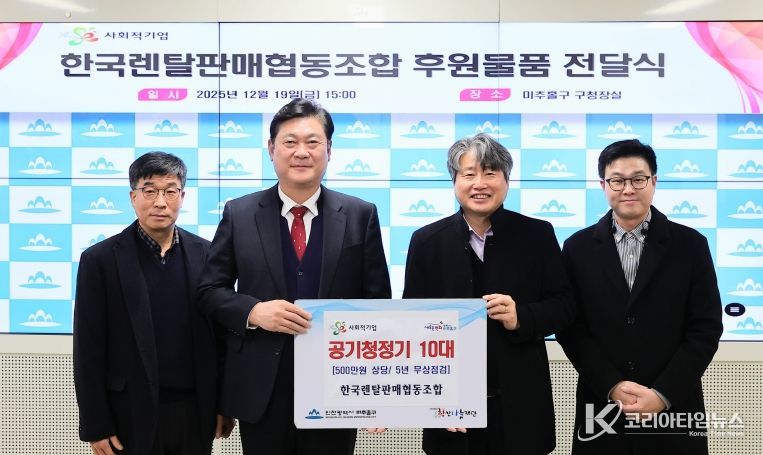 코리아타임뉴스 이아름 기자 | 인천 미추홀구는 지난 19일 사회적기업 한국렌탈판매협동조합(대표 정영이)으로부터 공기청정기 10대를 전달받았다.