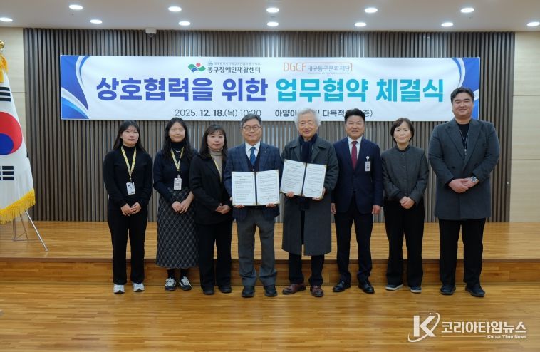 코리아타임뉴스 대구취재본부 | (재)대구동구문화재단(이사장 윤석준)과 동구장애인재활센터(센터장 이종근)는 지난 12월 18일, 지역 장애인의 건강증진과 생활체육 활성화를 위한 업무협약(MOU)을 체결했다.