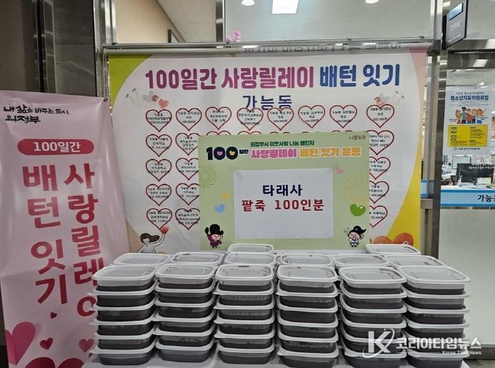 코리아타임뉴스 기동취재팀 | 의정부시 가능동주민센터는 12월 19일 한국불교태고종 타래사가 동지를 맞아 팥죽 100그릇을 기탁하며 ‘100일간 사랑릴레이 배턴 잇기’에 동참했다고 밝혔다.