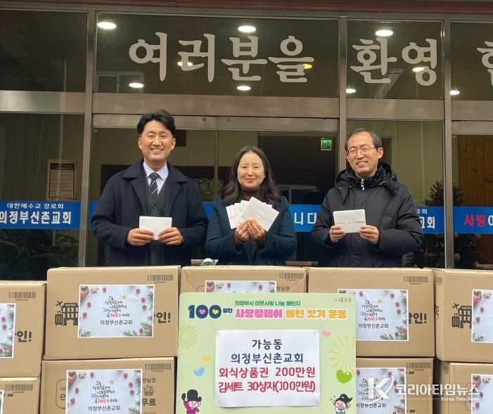 코리아타임뉴스 기동취재팀 | 의정부시 가능동주민센터는 12월 19일 의정부신촌교회가 성탄절을 맞아 외식상품권 200만 원과 김세트 100만 원 상당을 기탁하며 ‘100일간 사랑릴레이 배턴 잇기’에 동참했다고 밝혔다.