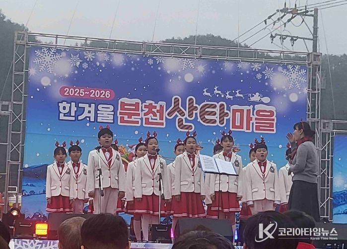 코리아타임뉴스 사회팀 | 봉화군 소천면 분천산타마을에서 지난 20일(토) 개최된 ‘2025 한겨울 분천산타마을 개장식’ 이 지역주민과 관광객들의 열띤 호응 속에 성황리에 열렸다. 이번 개장 축하공연에는 봉화교육지원청이 운영하는 봉꽃송이 청소년 합창단이 참여하여 한겨울 추위를 녹이는 따뜻한 무대를 선사했다.