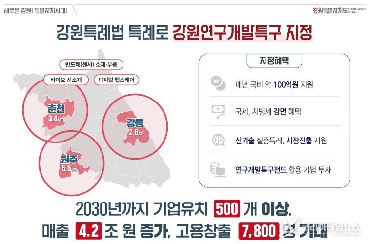 김진태 강원특별자치도지사는 “엄격한 요건으로 시도조차 못했던 불가능이 강원특별법 특례를 통해 가능하게 됐다”며, “춘천, 원주, 강릉을 중심으로 도 전역에서 미래산업이 크게 성장할 것으로 기대된다”고 밝혔다.