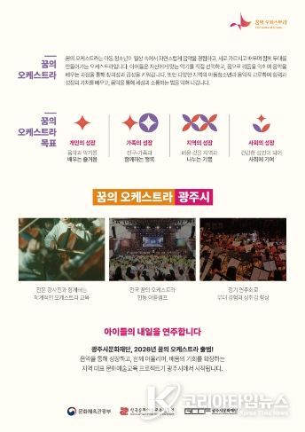 코리아타임뉴스 이아름 기자 | (재)광주시문화재단은 문화체육관광부가 주최하고 한국문화예술교육진흥원이 주관하는 ‘2026 꿈의 오케스트라 운영사업’에서 예비 거점기관 단계를 거쳐 최종 신규 거점기관으로 선정됐다고 22일 밝혔다.