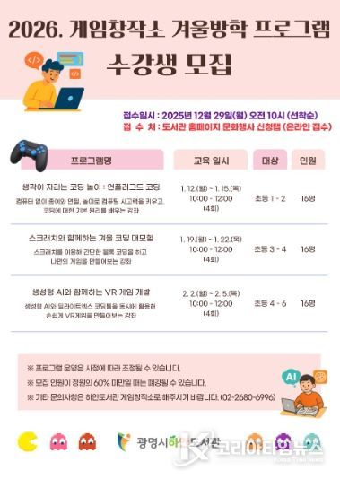 코리아타임뉴스 경기취재본부 | 광명시 게임창작소는 오는 29일 오전 10시부터 겨울방학 프로그램 수강생을 모집한다.