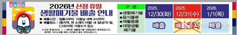 코리아타임뉴스 경남취재본부 | 거제시는 내년 1월 1일, 신정 휴일에는 생활폐기물 수거 대행업체의 휴무가 시행됨에 따라 일반생활·음식·재활용, 대형 생활폐기물이 수거되지 않는다고 밝혔다.