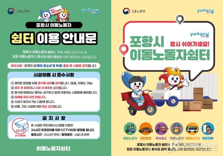 코리아타임뉴스 경북취재본부 | 포항시가 배달·대리운전 등 이동노동자의 휴식권을 보장하고 근로환경을 개선하기 위해 추진해온 ‘이동노동자 쉼터’를 오천읍과 상도동에 각각 개소하고 본격적인 운영에 들어갔다고 22일 밝혔다.