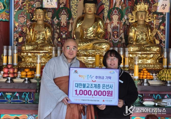코리아타임뉴스 기동취재팀 | 이천시 부발읍 산촌리에 위치한 대한불교조계종 은선사는 지난 12월 22일, 동지를 맞아 부발읍행정복지센터(읍장 이은미)에 후원금 100만 원을 기탁했다.
