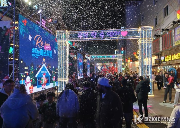 코리아타임뉴스 오영주 기자 | 거제시 고현 빛의 거리에서 열린 ‘고현 리본(Re-born), 첫눈 페스티벌’이 많은 시민과 관광객의 참여 속 성황리에 개최되며, 겨울철 도심 상권 활성화 가능성을 확인했다.