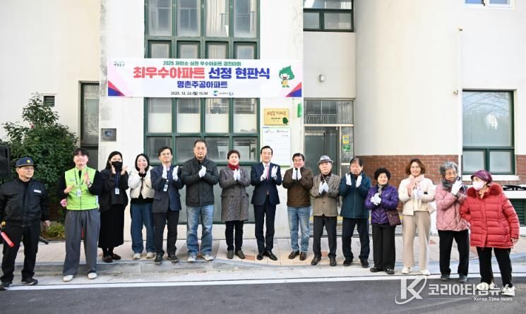 코리아타임뉴스 울산취재본부 | 울산 북구는 22일 2025년 저탄소 실천 우수아파트 경진대회에서 최우수아파트로 선정된 명촌주공아파트에서 현판식을 열었다.