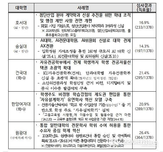 올해에는 '고등교육법 시행령'과 '대학설립·운영 규정' 개정 등 그간의 규제 개선* 내용을 토대로, 첨단 분야 계약학과 및 입학 정원 증원 등을 활용한 첨단 분야 학과 신설, 소단위 전공 과정과 연계한 전공자율선택제 확대 등 다양한 대학 혁신 사례들이 응모됐다. 1단계 전문가 평가 후 일반 국민들의 체감도를 반영하기 위한 2단계 온라인 국민심사(12.8~12.10., 소통24 온라인 투표)를 실시하여, 최종 5개 대학을 선정했다.
