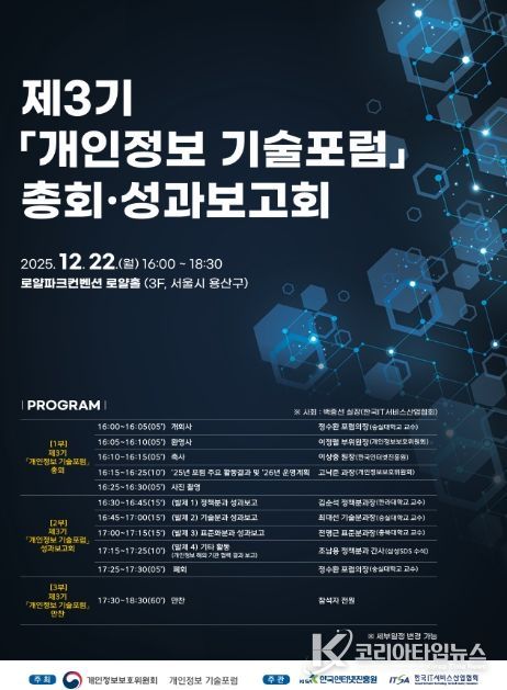 코리아타임뉴스 오영주 기자 | 개인정보보호위원회는 12월 22일 서울 용산구에서 개인정보 기술개발 활성화 및 산업 생태계 기반 구축을 위한 제3기 '개인정보 기술포럼(의장 정수환 숭실대 교수)' 총회·성과보고회를 개최했다.