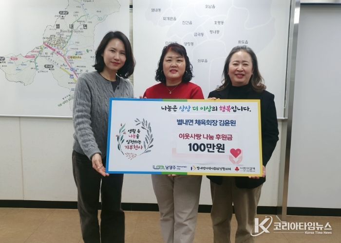 코리아타임뉴스 경기취재본부 | 남양주시는 지난 19일 김윤원 별내면 체육회장이 지역 내 취약 가구 지원을 위해 이웃사랑 성금 100만 원을 별내면 지역사회보장협의체에 기탁했다고 22일 밝혔다.