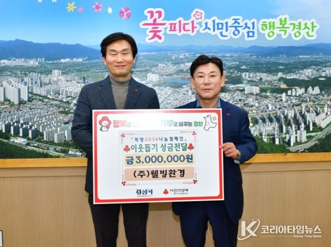 코리아타임뉴스 경북취재본부 | 경산시는 ㈜웰빙환경(대표이사 박상희)이 12월 19일 이웃돕기 성금 및 인재 육성을 위한 장학금 총 500만 원을 기탁했다고 밝혔다.