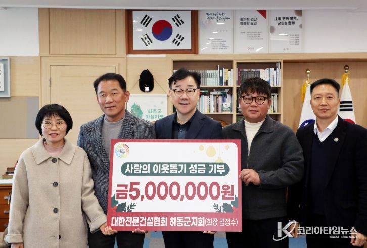 코리아타임뉴스 오영주 기자 | 하동군은 지난 22일 군수 집무실에서 대한전문건설협회 하동군지회(회장 김정수)가 어려운 세대를 돕기 위한 성금 500만 원을 기탁했다고 밝혔다.