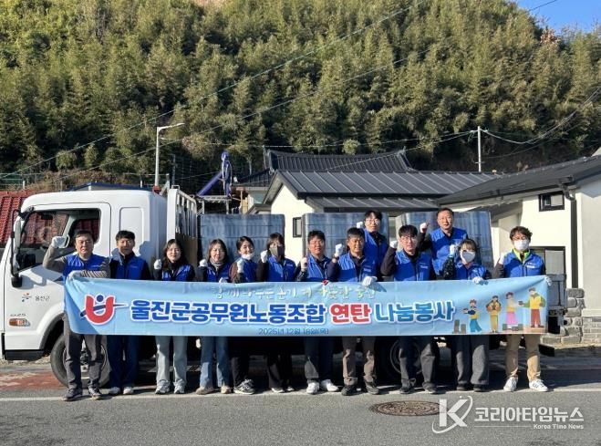 코리아타임뉴스 경북취재본부 | 울진군공무원노동조합은 지난 12월 18일 울진읍과 근남면에 거주하는 연탄 사용 가구 3곳을 대상으로 총 1,200장의 연탄을 전달하며 따뜻한 겨울나기를 지원했다.