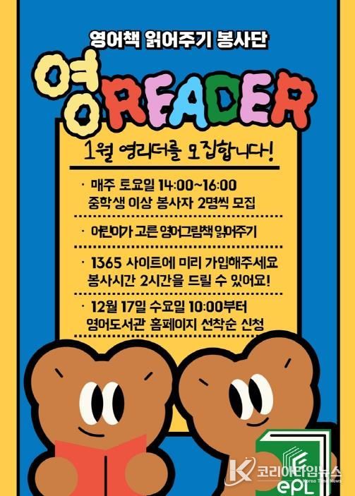 코리아타임뉴스 기동취재팀 | 의정부영어도서관은 2026년 1월부터 영어책 읽어주기 봉사단 ‘영리더’가 참여하는 재능기부 프로그램 ‘Please Read a Book’을 운영한다.
