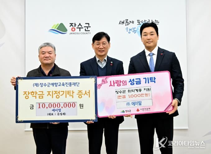 ㈜에이알은 지난 19일 장수군을 방문해 (재)장수군애향교육진흥재단에 장학금 1천만 원과 전북사회복지공동모금회를 통한 이웃돕기 성금 1천만 원 등 총 2천만 원을 기탁했다.