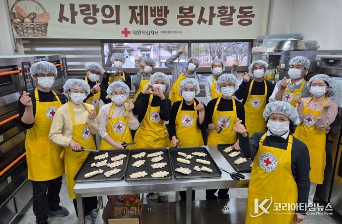 코리아타임뉴스 사회팀 | 전북특별자치도교육청 교육협력과 직원 20여 명은 23일 대한적십자사 희망나눔 제빵 봉사활동에 참여해 직접 만든 빵을 전주 호성보육원과 지역아동센터에 전달했다.