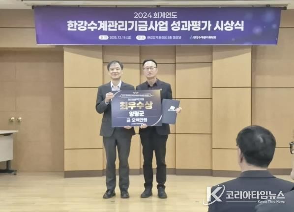코리아타임뉴스 기동취재팀 | 양평군은 지난 19일 한강유역환경청이 실시한 ‘2024년도 한강수계관리기금 성과평가’에서 주민지원사업 부문 최우수, 오염총량관리사업 부문 장려를 수상했다고 밝혔다.