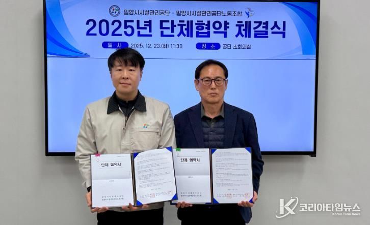 코리아타임뉴스 경남취재본부 | 밀양시시설관리공단은 23일 밀양시시설관리공단 노동조합과 2025년도 단체협약을 체결했다.