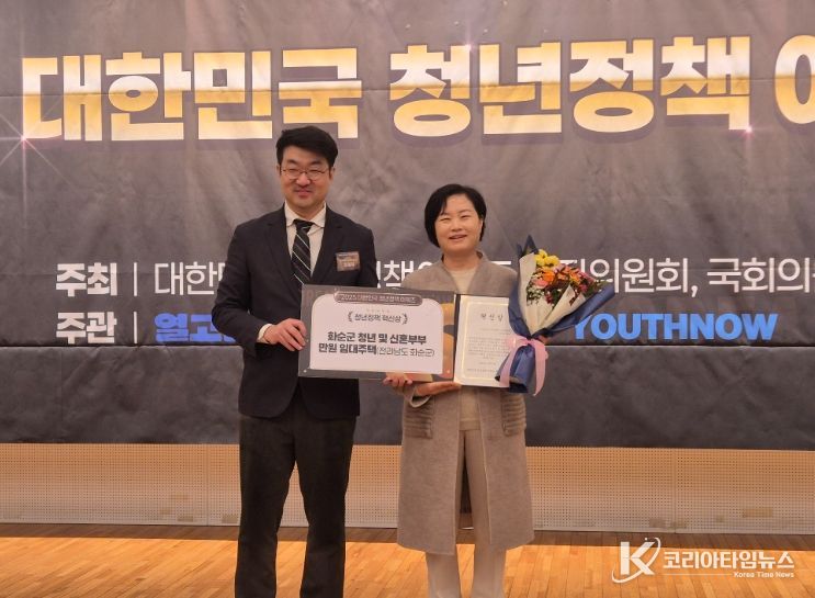 코리아타임뉴스 노승선 기자 | 화순군은 23일 국회도서관 대강당에서 열린 ‘2025 대한민국 청년정책 어워즈’에서 청년 및 신혼부부 만원임대주택 정책으로 ‘혁신상’을 수상했다고 밝혔다.