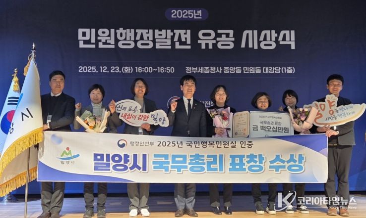 코리아타임뉴스 경남취재본부 | 밀양시는 23일 정부세종청사에서 열린 ‘2025년 민원행정발전 유공 시상식’에서 국민행복민원실 우수기관으로 선정돼 국무총리 표창을 수상했다.