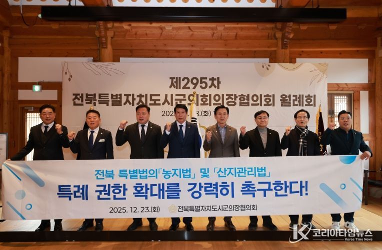 코리아타임뉴스 노승선 기자 | 지난 23일 무주 태권도원에서 열린 전북특별자치도 시군의회의장협의회(회장 남관우 전주시의회 의장) 월례회에서 손종석 순창군의회 의장이 건의한 전북특별법 핵심 특례인 '농지법'과 '산지관리법'의 실효성 확보를 위한 권한 확대를 촉구하는 건의안이 채택됐다.
