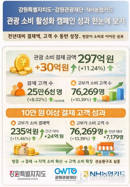 코리아타임뉴스 이아름 기자 | 강원특별자치도와 강원관광재단은 NH농협카드와 함께 추진한 ‘강원 관광소비 활성화 상생 캠페인’ 결과, 전년 동일 기간 대비 관광 소비 금액과 결제 고객 수가 모두 증가하며 실질적인 지역 소비 활성화 성과를 거둔 것으로 나타났다.