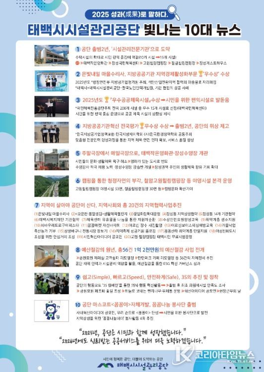 코리아타임뉴스 이아름 기자 | 태백시시설관리공단은 출범 2년을 맞아 2025년 한 해 동안의 주요 성과를 집약한 '2025년 공단 10대 뉴스'를 선정했다고 밝혔다.