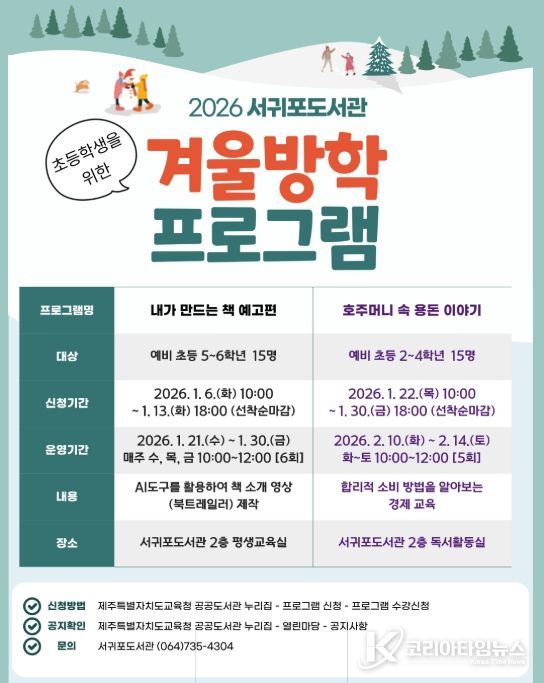 코리아타임뉴스 사회팀 | 제주도교육청 서귀포도서관은 겨울방학을 맞아 어린이들의 호기심을 자극해 책 읽기의 즐거움과 경제 감각을 키우는 겨울방학 프로그램을 운영하며, 내년 1월 6일부터 참가자를 모집한다.