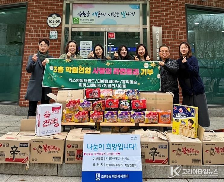 코리아타임뉴스 사회팀 | 수원시 장안구 조원2동은 지난 24일 관내 한일타운주상가 학원 연합회로부터 어려운 이웃을 위한 라면 40개입 14박스를 기탁받았다고 전했다.