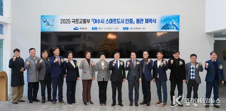코리아타임뉴스 전남취재본부 | 여수시는 호남권 최초로 국토교통부 주관 ‘2025년 스마트도시 인증’에 선정되면서 지난 24일 시청 본관 1층 로비에서 동판 제막식을 개최했다.