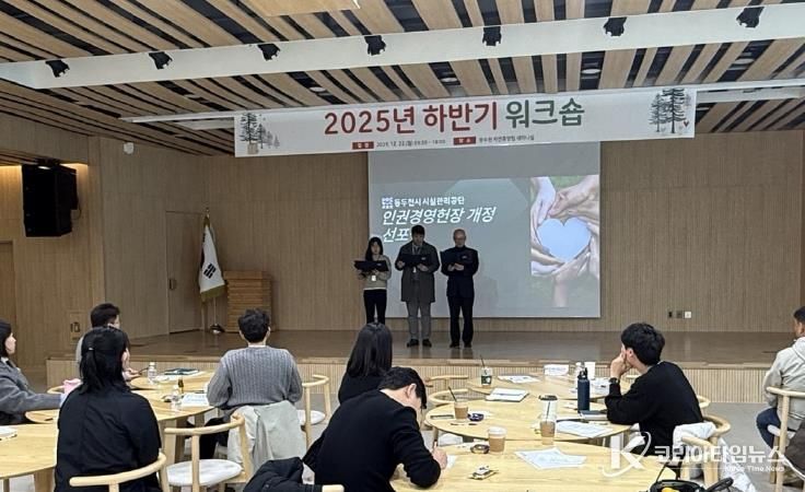 코리아타임뉴스 경기취재본부 | 동두천시 시설관리공단은 지난 22일 동두천 자연휴양림 세미나실에서 열린 2025년 하반기 워크숍에서 인권경영 헌장 개정 및 선포식을 개최했다고 밝혔다.