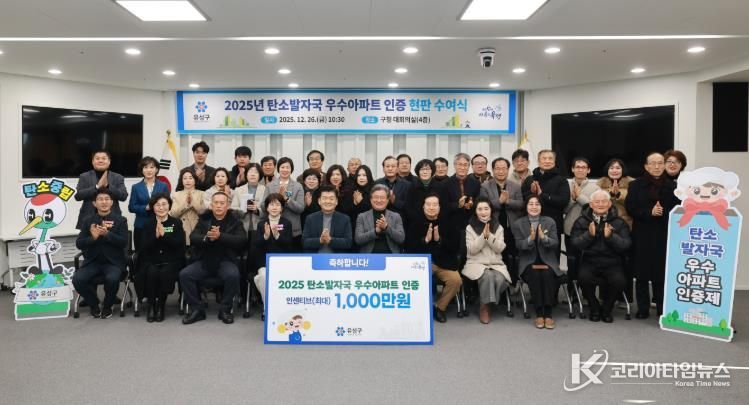코리아타임뉴스 대전취재본부 | 대전 유성구는 26일 유성구청 대회의실에서 ‘2025년 탄소발자국 우수아파트 인증 현판 수여식’을 개최했다.