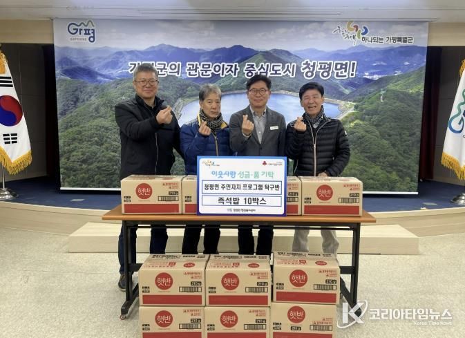 코리아타임뉴스 기동취재팀 | 가평군 청평면 주민자치 프로그램 탁구반 회원들은 최근 청평면 행정복지센터를 방문해 소외된 이웃들이 따뜻한 겨울을 보내길 바라는 마음으로 즉석밥 10박스를 기탁했다.