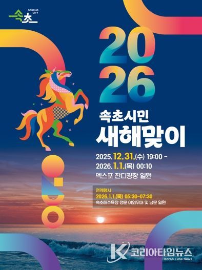 코리아타임뉴스 노승선 기자 | 속초시가 병오년 ‘붉은 말의 해’를 맞아 12월 31일(수) 저녁 7시부터 엑스포 잔디광장 일원에서 ‘2026 속초시민 새해맞이 행사’를 개최한다. 다채로운 프로그램이 이어지며 시민의 안녕과 희망찬 새해 출발을 기원하는 화합의 시간이 될 전망이다.