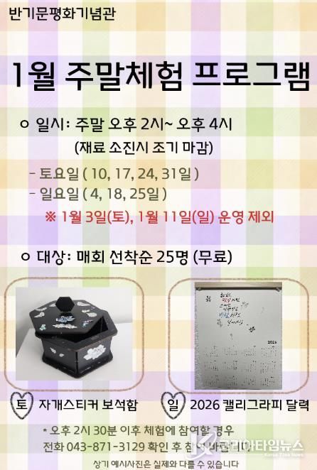 해당 프로그램은 1월 토요일(10·17·24·31일)과 일요일(4·18·25일)에 반기문 평화기념관 1층에서 오후 2시부터 4시까지 진행된다. 단, 1월 3일, 11일은 운영하지 않는다.