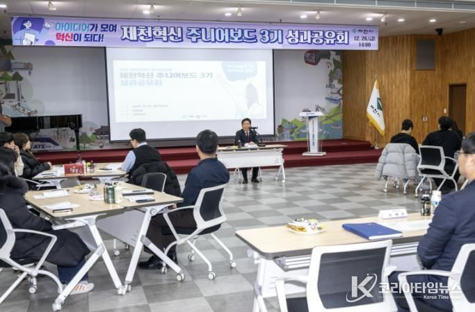 코리아타임뉴스 충북취재본부 | 제천시는 지난 26일 ‘제천혁신 주니어보드 성과공유회’를 개최하고, 주니어보드 3기가 지난 1년간 발굴한 혁신 아이디어를 발표하고 공유하는 뜻깊은 시간을 가졌다.