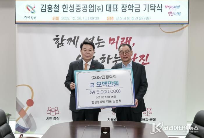 코리아타임뉴스 김택호 기자 | (재)당진장학회는 지난 26일 당진장학회 이사로 재임중인 김홍철 한성중공업㈜ 대표가 당진장학회에 장학금 500만 원을 기탁했다고 29일 밝혔다.