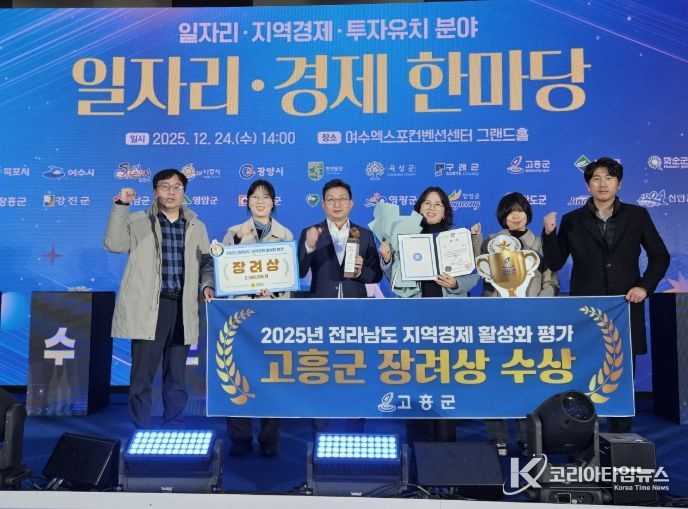코리아타임뉴스 전남취재본부 | 고흥군은 2025년 전라남도 일자리경제 한마당 행사 시상식에서 ‘2025년 지역경제 활성화 평가’ 장려상을 수상해 기관 표창과 함께 200만 원의 시상금을 받았다고 29일 밝혔다.