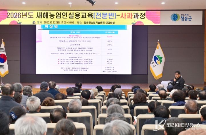 코리아타임뉴스 노승선 기자 | 청송군은 지난 22일부터 24일까지 3일간 청송군농업기술센터 대회의실에서 실시한 ‘2026년도 새해농업인 실용교육(전문반)’을 성황리에 마무리했다고 밝혔다.