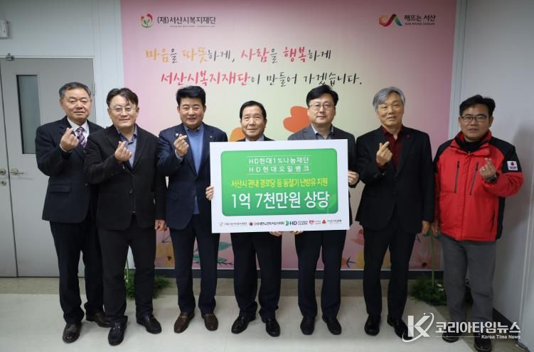 코리아타임뉴스 김택호 기자 | HD현대오일뱅크와 HD현대1%나눔재단이 서산 지역 어르신들의 겨울나기를 돕기 위해 동절기 난방비 지원 전달식을 가졌다고 29일 밝혔다.