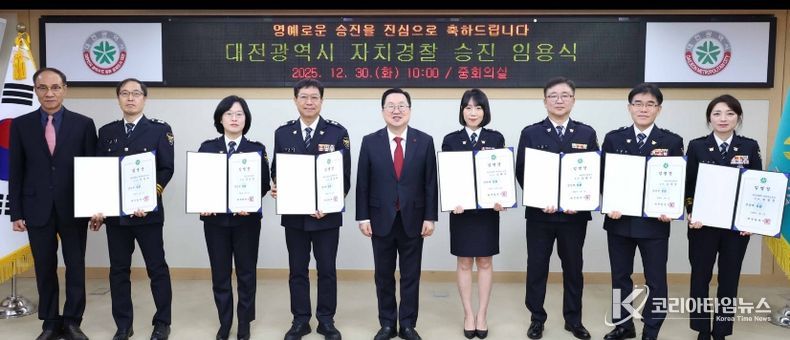 코리아타임뉴스 대전취재본부 | 대전시 자치경찰위원회는 30일 대전시청 중회의실에서 이장우 대전시장과 박희용 자치경찰위원장, 동료 직원들이 참석한 가운데 자치경찰 승진 임용식을 개최했다.