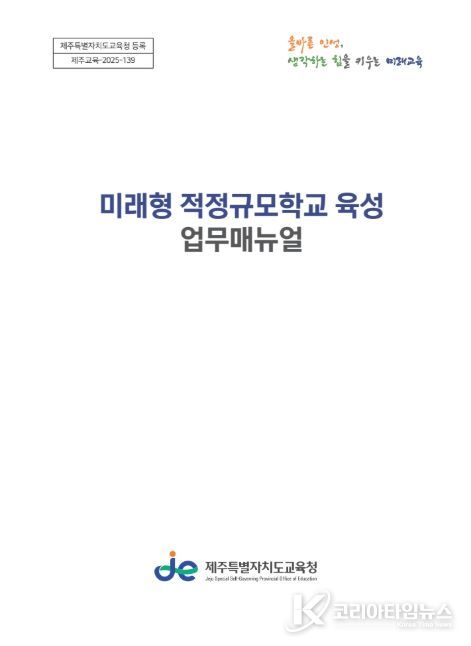 코리아타임뉴스 사회팀 | 제주특별자치도교육청은 31일 적정규모학교 육성과 소규모학교의 지속 가능한 학교 운영을 체계적으로 지원하기 위해 ‘미래형 적정규모학교 육성 업무지침서’를 제작하고 도내 작은 학교와 교육지원기관에 보급했다.