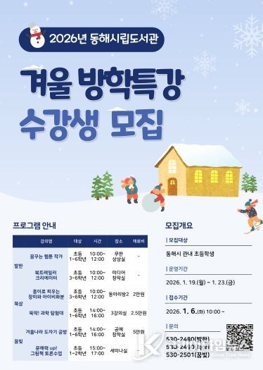 코리아타임뉴스 이아름 기자 | 동해시는 2026년 겨울방학을 맞아 관내 초등학생을 대상으로 동해시립도서관에서 겨울방학 특강 프로그램을 운영한다고 밝혔다.
