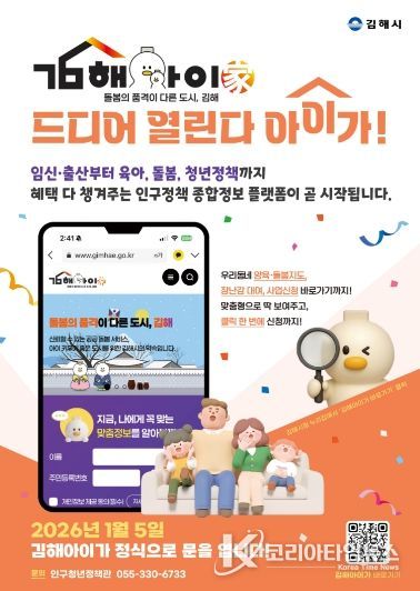 코리아타임뉴스 오영주 기자 | 김해시는 시민 누구나 임신부터 출산, 육아, 돌봄, 청소년, 청년 지원정책까지 한눈에 확인하고 신청할 수 있는 인구정책 종합정보 플랫폼‘김해아이가(家)’를 오는 5일 정식 오픈한다고 2일 밝혔다.