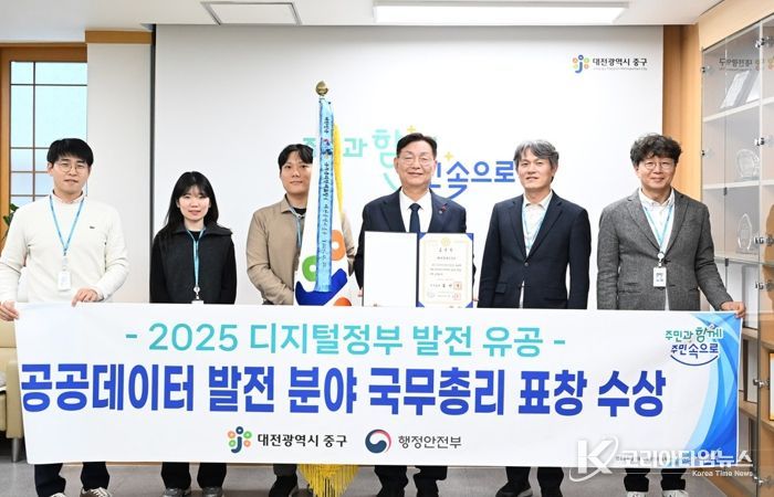 코리아타임뉴스 대전취재본부 | 대전 중구는‘2025 디지털정부 발전 유공 정부포상’공공데이터 발전 부문에서 전국 기초자치단체 중 유일하게 국무총리 기관 표창을 수상했다고 4일 밝혔다.